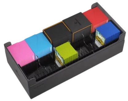 Designed for storing standard sized sleeved cards, the Cards’ Rail can hold up to 500 double sleeved cards in extra thick Inner Sleeves*. The 4 removable dividers can be moved into different positions and their optimized shape allows easy access to the cards. Thanks to the special handles on both sides, the Cards’ Rail can be easily removed from the Dungeon.