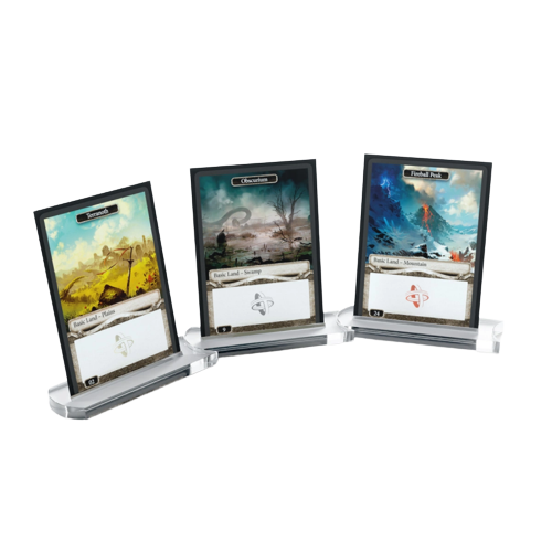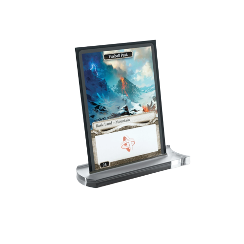 These minimalist, flat and elegant premium card stands can hold almost any playing card (up to standard size, with or without sleeve). Use them during the game to hide a card’s information from others or to increase the visibility of a card to other players. Thanks to the ingenious, alignable design, the card stands can be placed next to each other in a row or in a (semi) circle. They are also perfect for turning your favorite card into a decorative element for any bookshelf.