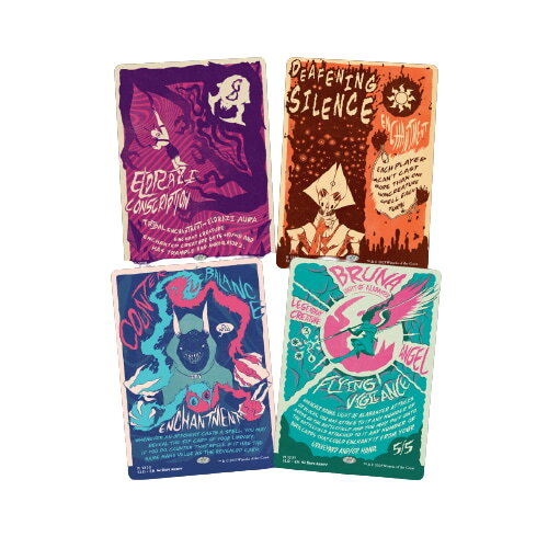 – several Magic: The Gathering cards with hand-drawn illustration style