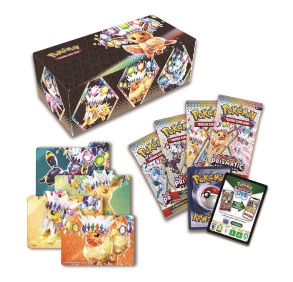 Includes four Prismatic Evolutions booster packs , an elegant storage box with four dividers and a randomly etched promo card featuring Evoli or one of its Evolutions as a Stellar Tera Pokémon ex.