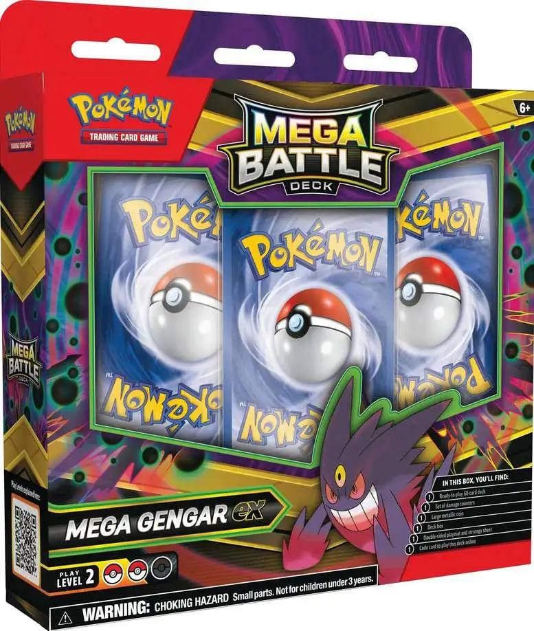 It’s time for a Mega Battle! Two new Pokémon Trading Card Game: Mega Battle decks are ready for battle! Team up with Mega Gengar ex and fight from the shadows or summon Mega Diancie ex and dazzle your opponents with your skills. Each deck contains a powerful Pokémon ex and everything you need to get started right away. In each box you’ll find: 1 ready-to-play deck of 60 cards, 1 set of damage counters, 1 large metal coin, 1 deck box, 1 double-sided play mat and strategy sheet, and 1 code card to play this deck online.