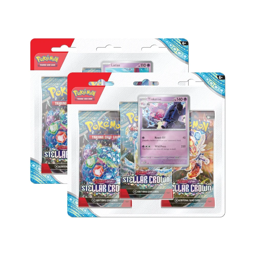 The Pokémon Trading Card Game – Stellar Crown three-pack blister contains: