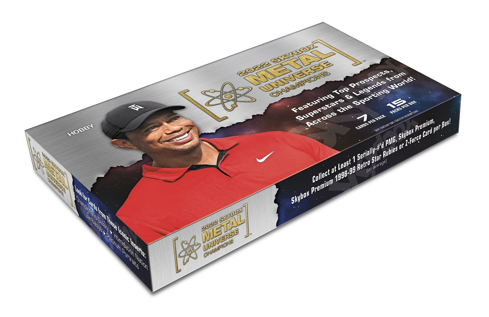 Hobby Box with 15 Boosters from the “Upper Deck Skybox Metal Universe Champions 2022” Trading Cards Collection. Each Booster contains 7 cards, so the box contains a total of 105 cards.