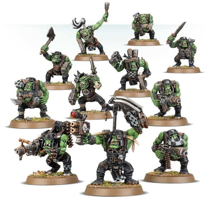 This set contains 11 multi-part plastic Orks Boyz and includes options for guns, spaltaz, wummers, heavy weapons and stikkbombz. The models are supplied with round bases (32 mm).