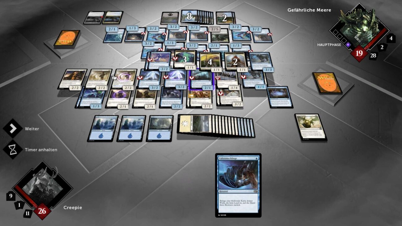The “game” is referred to as the playing field. Magic cards often say: “When this card comes into play, …..”, which refers to the playing field. At the start of the game, you have nothing in play yet, but this is where most of the action happens later. On each of your turns, you can play a land from your hand. Most cards have to come into play first before an effect occurs. Creatures, artifacts, enchantments and Planeswalkers also come into play after they resolve. You can arrange your permanents however you like, but your opponent must have all cards in view and be able to see whether they are tapped or not.
