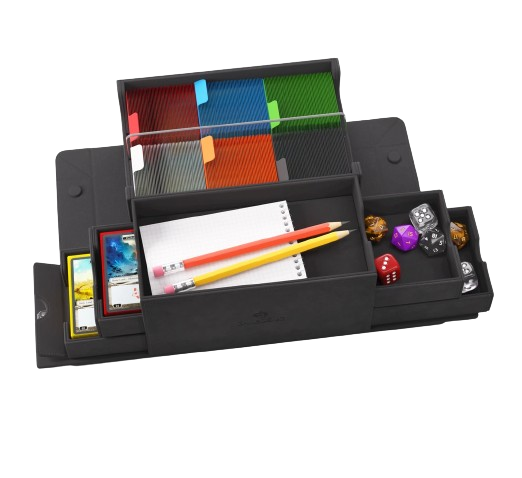 La boîte contient 4 tiroirs au total : 2 tiroirs amovibles avec des rabats magnétiques ingénieux qui garantissent un retrait sans effort et un accès facile aux cartes sleeved ou même à des decks entiers ; jusqu’à la dernière carte. Ajoutez à cela 2 autres compartiments extra larges pour encore plus de pions, de dés, d’accessoires, etc. Le compartiment supérieur du Games’ Lair 600+ peut être utilisé pour les compteurs de points de vie, les cartes surdimensionnées, les blocs d’écriture traditionnels, les accessoires pour pen-and-paper et bien d’autres choses encore.