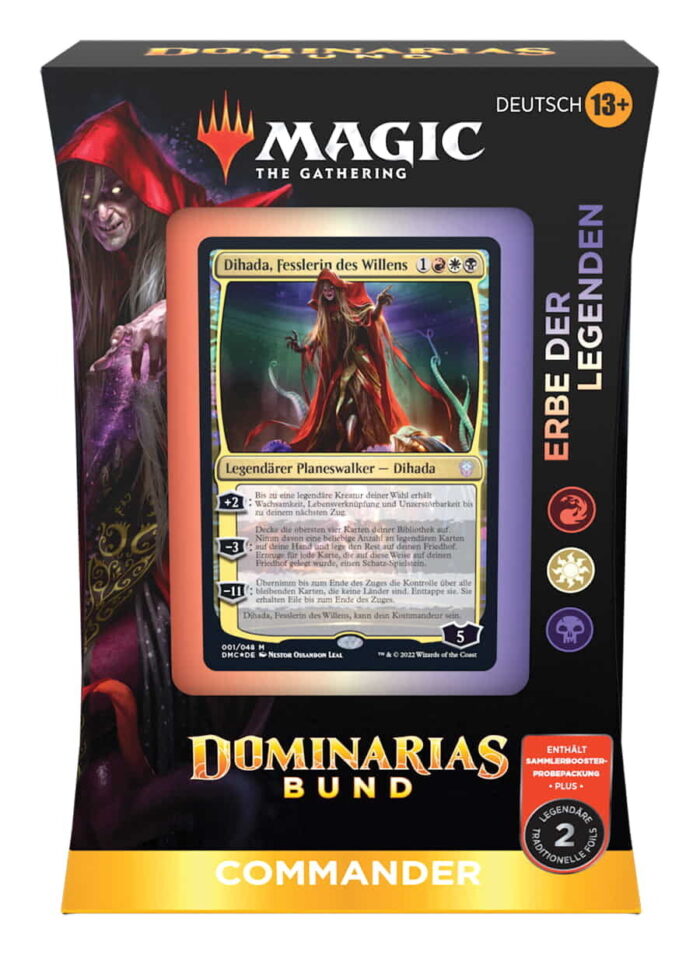 Les decks Commander de Dominarias Bund contiennent un deck prêt à jouer de 100 cartes Magic (2 cartes légendaires foil traditionnelles + 98 cartes non foil), un paquet d’essai booster collector de 2 cartes, 1 carte de commandeur présentoir en tant que carte à foil étoffé (un exemplaire de la carte de commandeur en carton avec un effet de voile sur le bord de la carte et dans l’illustration), 10 cartes de pions double face, 1 boîte de deck (pouvant contenir 100 cartes avec leurs étuis), 1 roue de points de vie, 1 supplément de stratégie et 1 carte de référence des règles.