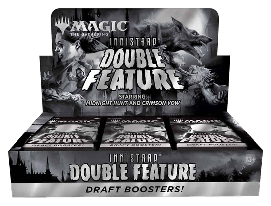 Ce set spécial réunit les histoires de loups-garous, vampires, fantômes et autres créatures de la nuit dans un produit unique. Le point fort d’Innistrad Double Feature est son look spécial de film d’horreur classique en noir et blanc, qui donne à toutes les cartes un aspect atmosphérique et digne d’être collectionné.