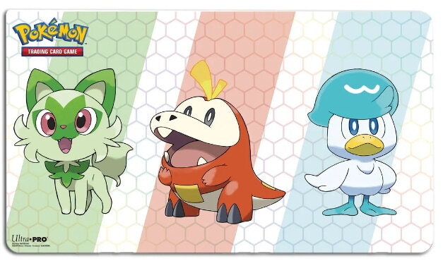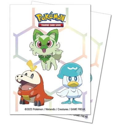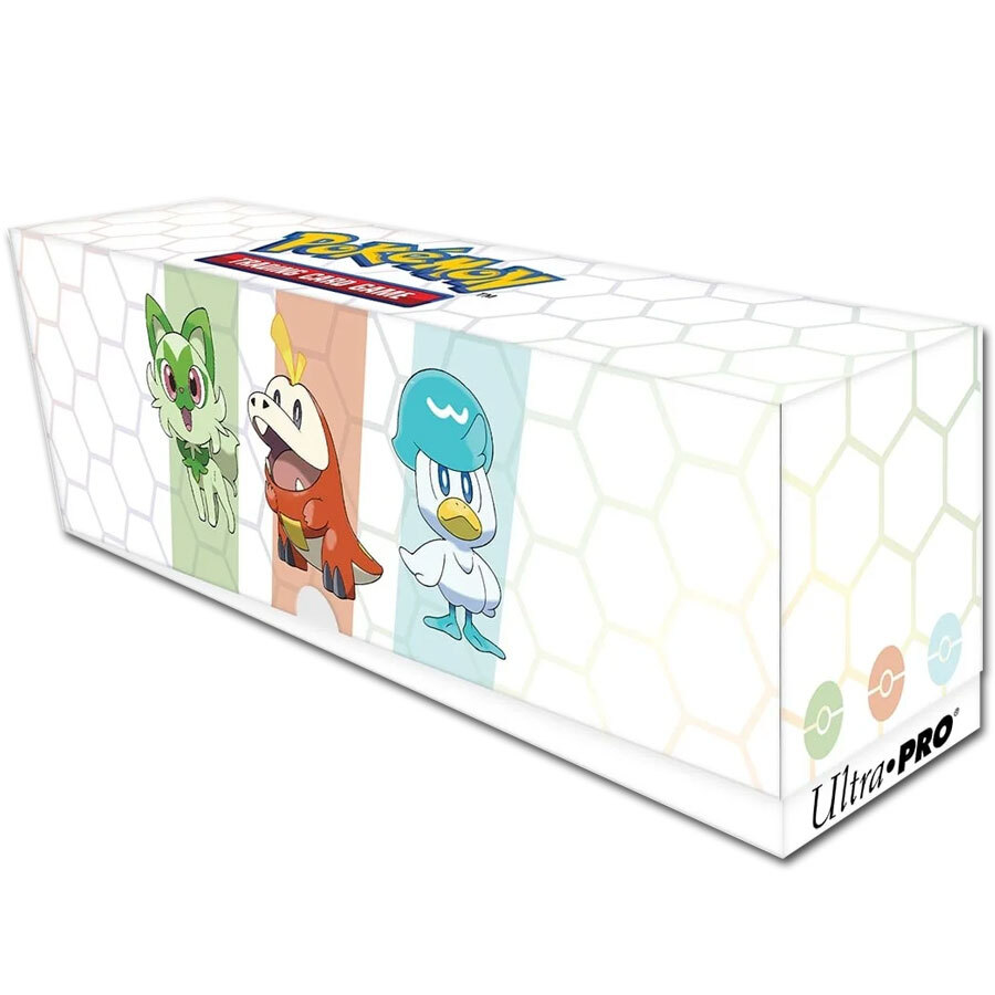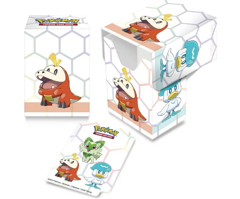 Ce paquet spécial comprend un tapis de jeu, 65 pochettes Deck Protector et une boîte de deck avec un diviseur de deck assorti. Tous les accessoires sont emballés dans une boîte de rangement de cartes à thème qui peut contenir jusqu’à 500 cartes sleevées. Les accessoires représentent les Pokémon de démarrage populaires Felori, Krokel et Kwaks. Ce pack de Noël est un cadeau idéal et un must pour tous les dresseurs ou collectionneurs de Pokémon.