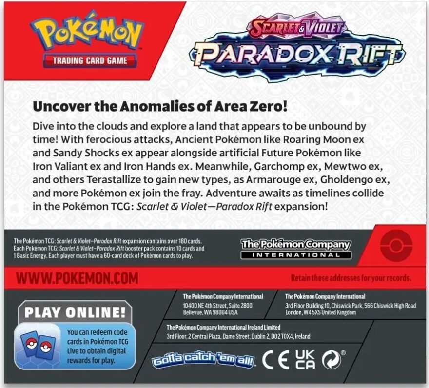 Plongez dans les nuages et explorez une terre qui semble ne pas être liée par le temps ! Avec des attaques féroces, des Pokémon anciens comme Donnersichel ex et Sandfell ex apparaissent aux côtés de Pokémon artificiels du futur comme Guerrier de l’arsenic ex et Eisenhand ex. Pendant ce temps, Knakrack ex, Mewtu ex et d’autres deviennent des Terastallis pour obtenir de nouveaux types, tandis que Crimanzo ex, Monetico ex et d’autres Pokémon ex se joignent au combat. Dans l’extension Pokémon TCG : Karmesin & Purpur Paradoxrift, les lignes temporelles entrent en collision et des aventures vous attendent !