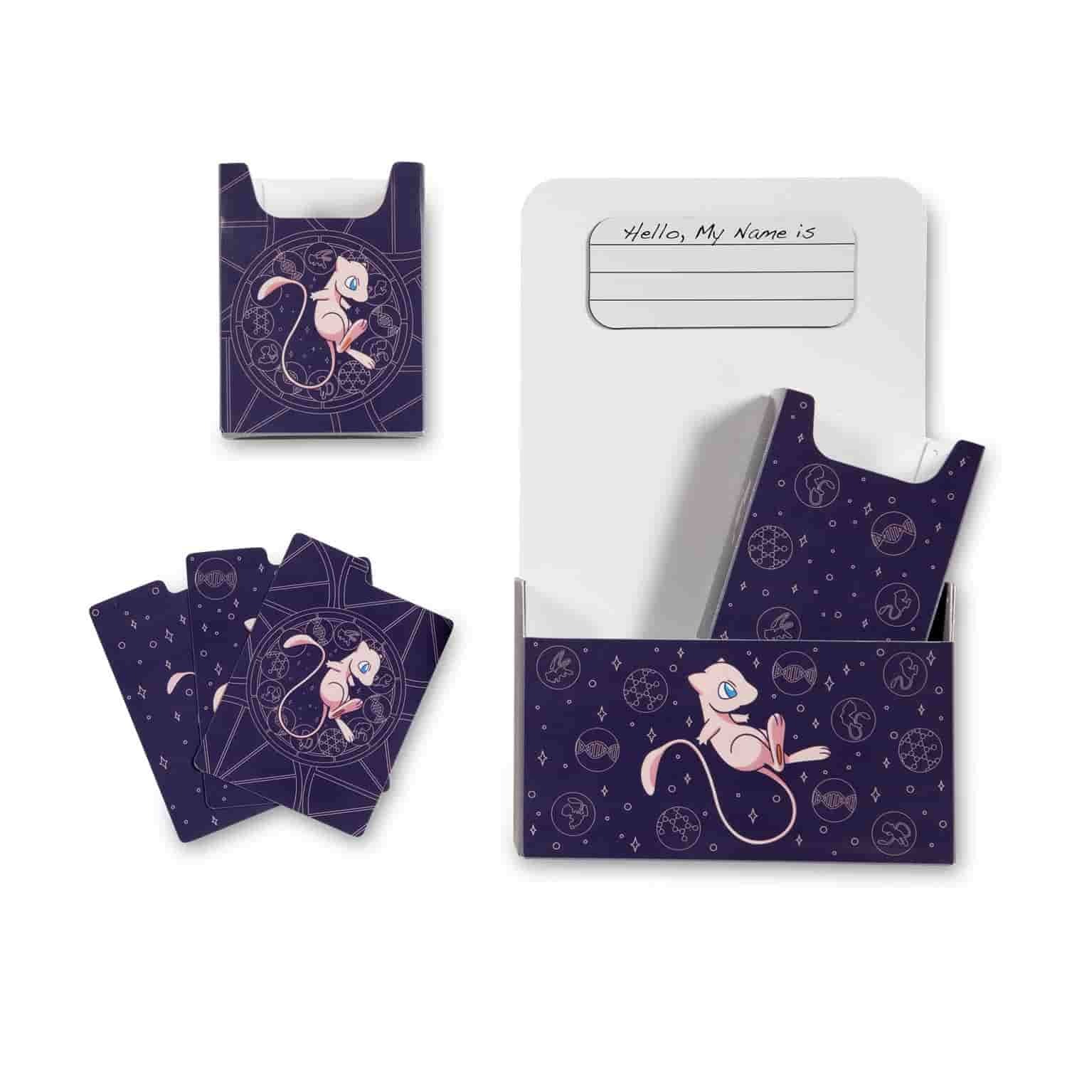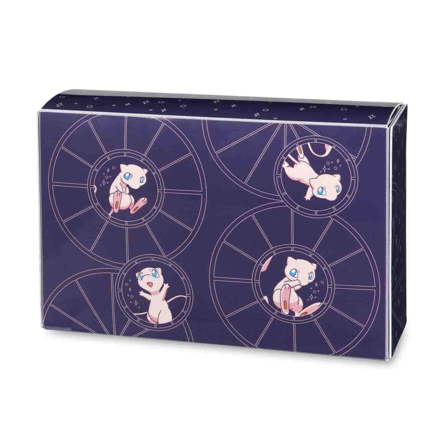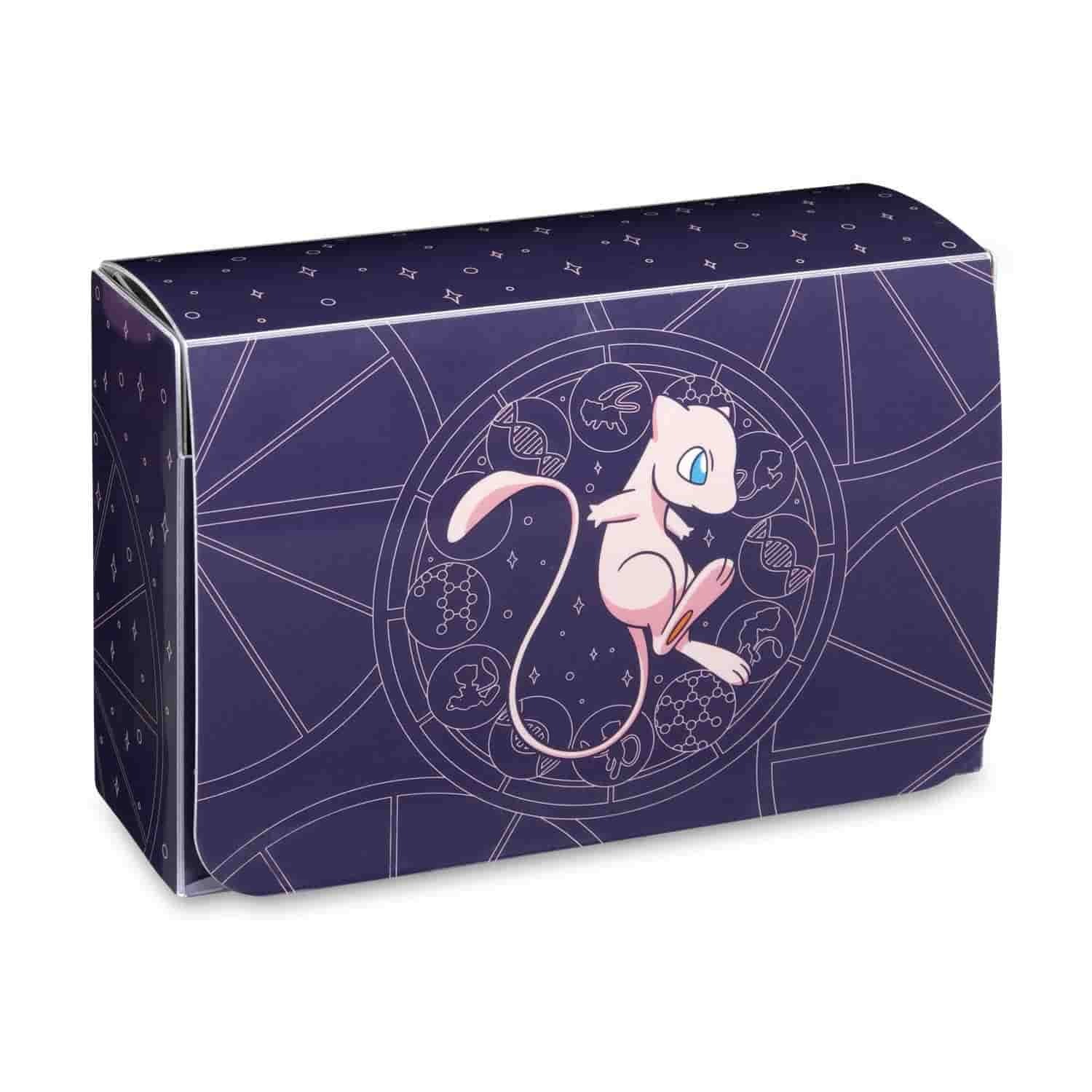 Mew est tout au sujet des étoiles et des sphères sur cette double boîte de jeu magnifiquement détaillée ! Le mystérieux Pokémon mythique décore deux boîtes de jeu emboîtées dans un étui pratique et robuste qui est également livré avec trois séparateurs pour vous aider à organiser vos cartes et accessoires.