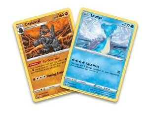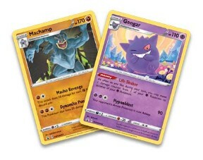 - 2 cartes holographiques des Pokémon partenaires des deux maîtres d’arène : Machomei et Gengar ou Montecarbo et Lapras