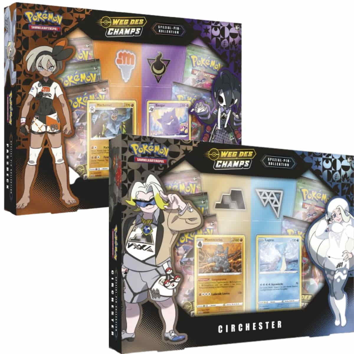 Cette superbe collection comprend deux pin’s à collectionner avec les deux logos d’arène, des cartes holographiques avec le Pokémon partenaire des deux chefs d’arène et cinq boosterpacks de l’extension spéciale Weg des Champs. Continuez votre voyage et battez vos rivaux !