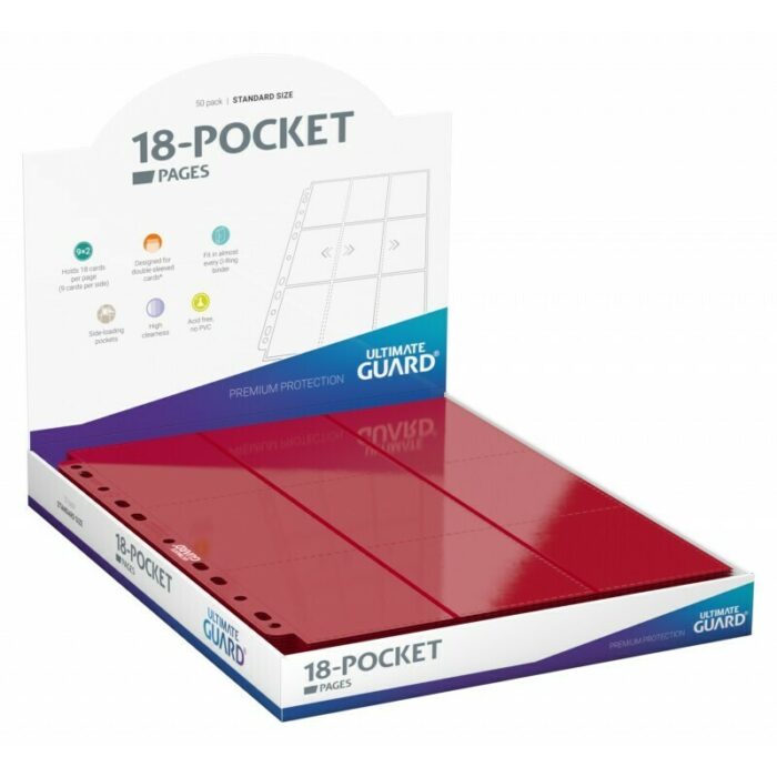 Pages de classeur double face de haute qualité (9 pochettes sur chaque page), adaptées à presque tous les classeurs à anneaux, pour le transport et le stockage de jusqu’à 18 cartes à collectionner dans deux pochettes (double-sleeved) par page. Chaque Pack contient 50 pages.