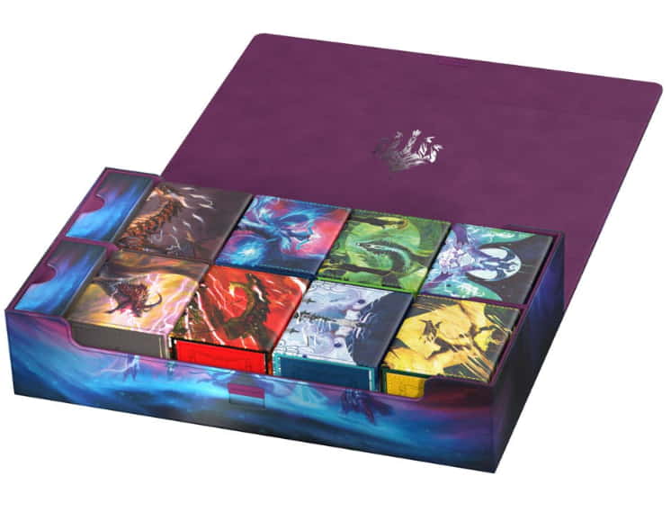 L’Omnihive 1000+ Xenoskin rassemble les puissants dragons fantômes de Tarkir dans une seule boîte de deck ! Avec ses deux grands compartiments principaux et ses deux compartiments magnétiques à positionnement flexible, l’Omnihive a été conçue pour stocker simultanément jusqu’à 1000 cartes individuelles (double-sleeved), plusieurs deck-boxes, des accessoires tels que des dés et/ou des play-mats. La surface résistante en Xenoskin arbore l’artwork Call the Spirit Dragons de Liiga Smilshkalne, tiré du set Tarkir Dragonstorm de Magic : The Gatherings. Le couvercle de l’Omnihive est sécurisé par de puissants aimants et notre mécanisme ZnapClaw, tandis que la housse en microfibre à l’intérieur offre une protection supplémentaire pour les cartes, les boîtes de deck et les accessoires.