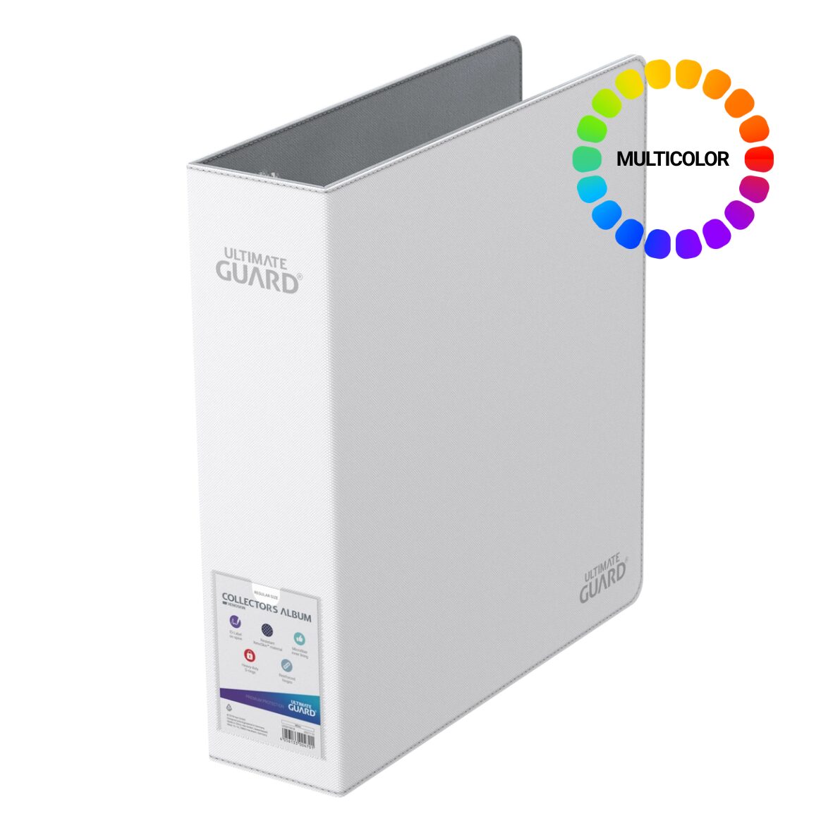Dossier de haute qualité à 3 anneaux de 70 mm de large avec finition XenoSkin, anneaux en D renforcés pour les pages de 18 poches de taille standard et dos transparent avec étiquette d’indexation inscriptible.