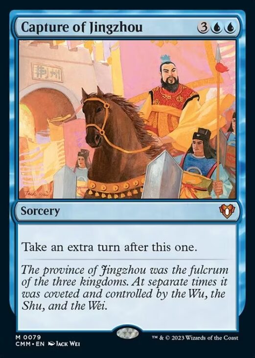 Die Karten, welche bisher bekannt sind, sind bereits sehr überzeugend. Gute Reprints, starke neue Karten, was erwartet man mehr von Commander Masters? Natürlich werden noch viele weitere Karten im Set enthalten sein, trotzdem ”schmeckt” diese Vorspeise bereits SEHR gut. eine der interessantesten Karten dieser neuen bekannten aus dem Commander Masters Set ist ”Capture of Jingzhou”. Diese Karte wurde damals im ”Portal Three Kingdoms” Set released welches hauptsächlich für den asiatischen Markt entworfen wurde. Es gab nur einen sehr kleinen Englischen Print-Run in Australien, daher auch das etwas teurere Preisschild von 110 USD. Alle blau Spieler haben somit einen Grund mehr sich auf das Commander Masters Set zu freuen.