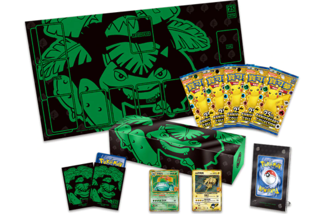 - Fünf 25th Anniversary Collection Boosterpacks mit jeweils fünf Karten Verschiedenes, an Bisaflor angelehntes Zubehör, einschließlich einer Spielmatte, Kartenhüllen und eines Kartendisplays.