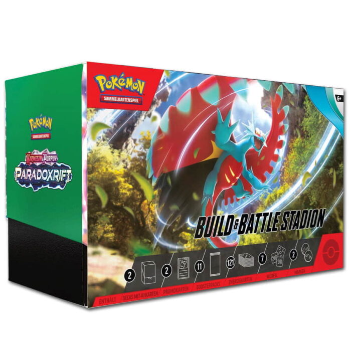 Dieses Build & Battle Stadion der Pokémon-Sammelkartenspiel-Erweiterung Karmesin & Purpur – Paradoxrift enthält ein umfangreiches Kartenset, darunter zwei Build & Battle Boxen.