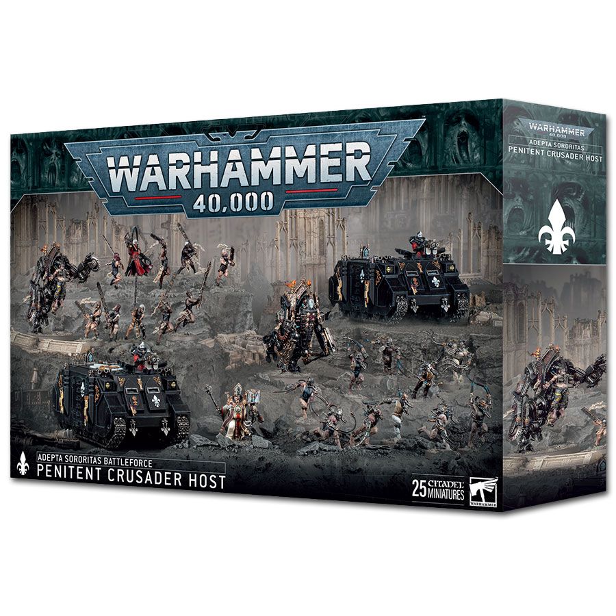 Hilf diesen abtrünnigen Schwestern mit diesem Box-Set, wieder in die Gnade des Imperators zurückzukehren. Die Penitent Crusade Host wird von einem kompromisslosen Ministorum-Priester in die Schlacht geführt, der die Repentia und Arco-Flagellants unter seiner Aufsicht inspiriert, während sie aus zwei Rhino-Truppentransportern aussteigen. Sie werden von zwei Penitent Engines begleitet, die von denen gesteuert werden, die noch eine Chance haben, für ihre Verbrechen zu büßen.
