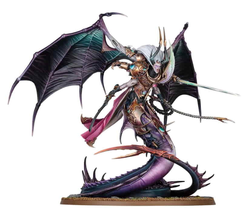 Fulgrim verkörpert die Verderbtheit und Korruption seiner einst edlen Legion. Seine gewundene Schlangengestalt überragt das Schlachtfeld und bewegt sich mit blitzschneller Geschwindigkeit. Seine Peitsche und sein peitschender Schwanz zerstreuen alle, die sich von der grotesken Pracht seiner dämonischen Gestalt betören lassen. Jeder, der der betäubenden Aura des Dämonenprimarchen widerstehen kann, wird mit Leichtigkeit niedergestreckt.