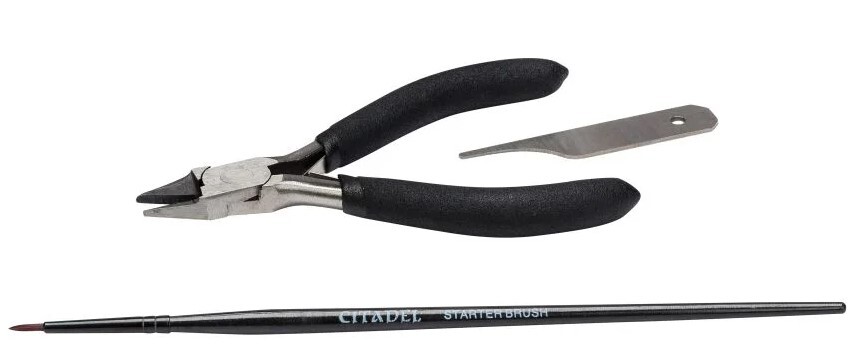 Beginne mit einer bequemen Schere, um deine Modelle aus dem Rahmen zu nehmen, einem Formlinienschaber, um sie für die Bemalung vorzubereiten, und einem Einsteigerpinsel, der genau die richtige Größe hat, um die Grundlagen zu bemalen.