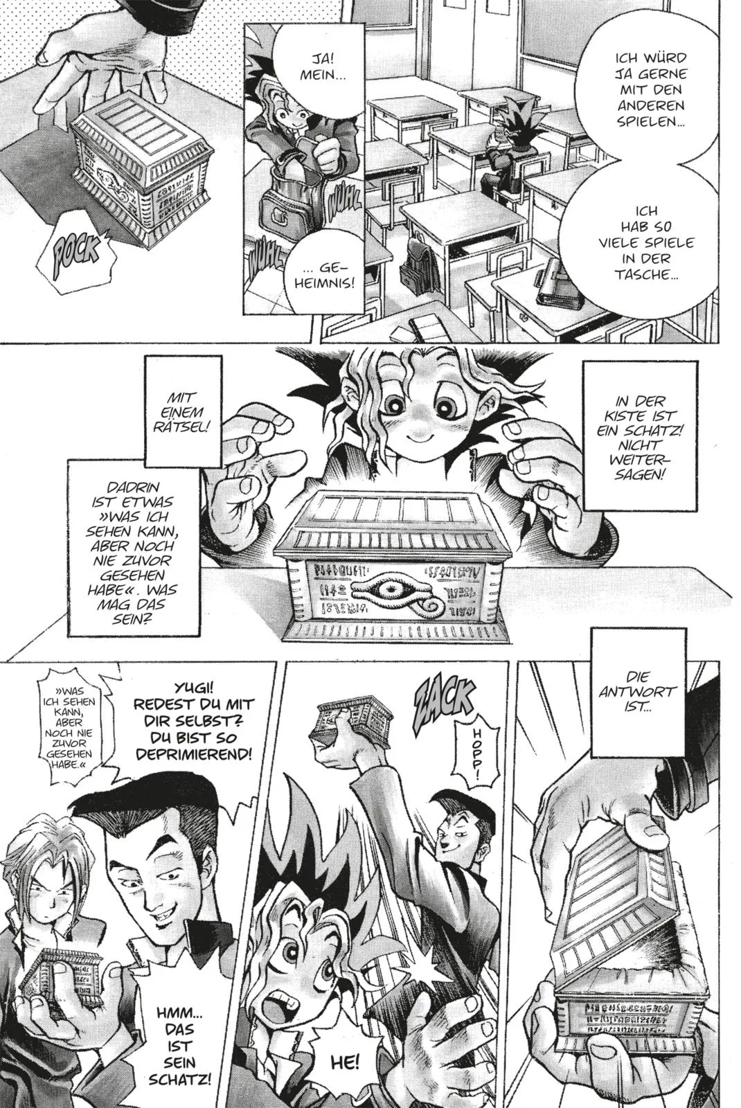 Band 1: Yugi Muto schafft das Unglaubliche: In einer langen Nacht löst er das schwierige Milleniumpuzzle. Nur noch ein Teil fehlt. Jonouchi, ein Klassenkamerad bringt Yugi das verlorengegangene Puzzle-Teil. Das ist der Beginn einer grossen Freundschaft und der Moment, in dem Yugi das erste Mal sein zweites Gesicht zeigt.